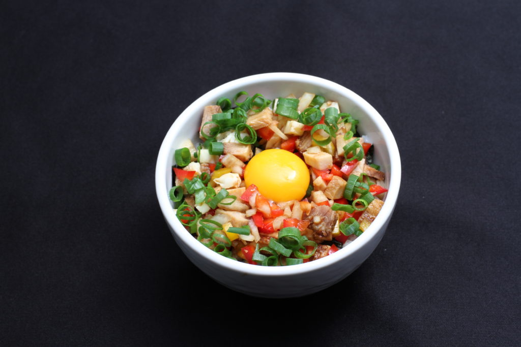 熟成チャーシューに赤と黄色のパプリカ、卵白ソテー、玉ねぎを「特製のチャーシュータレ」とともにタルタルし、「平飼い有精卵」の卵黄と共にライスボールにしました。